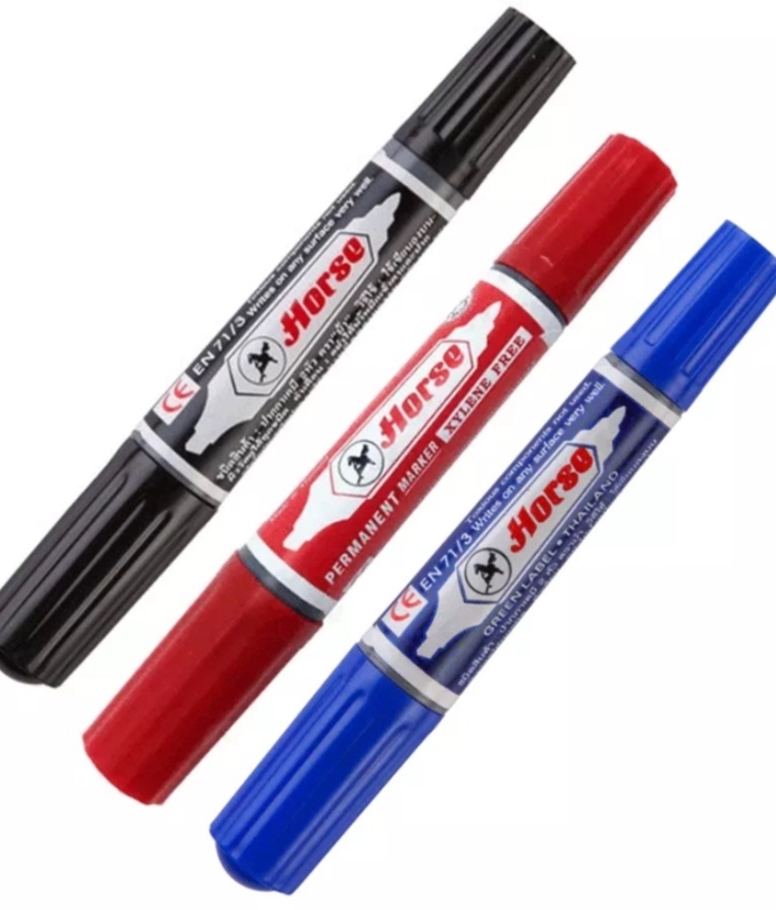 ปากกาเคมี 2 หัว Horse(ตราม้า) ปากกาเคมีหัวตัดและหัวกลมในด้ามเดียวหัวกลม ปากกามาร์คเกอร์ 2 หัว หมึกสีเข้ม แห้งไว ติดทน กันน้ำ เป็นชนิดหมึก Permanent ลบไม่ได้ 2 หัวในด้ามเดียว ทั้งหัวแหลมขนาด 2 มม. และหัวตัดขนาด 5 มม. สามารถเขียนบนกระดาษ พลาสติก โลหะ ไม้ และอื่นๆ ได้อย่างถาวร และยังสามารถเติมน้ำหมึกได้เมื่อหมึกซีดจาง ผ่านการรับรองมาตรฐานการปลอดสารพิษ ASTM D-4236 จากสหรัฐอเมริกา และ CE EN-71/3 จากสหภาพยุโรป ปลอดสารไซลีน 100 %